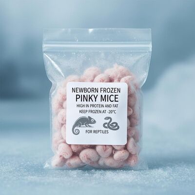 High-quality frozen pinky mice (Mus Musculus) specifically bred as feeder rodents for reptiles, birds of prey, and exotic pets. These newborn mice are carefully frozen at -20°C to preserve freshness and nutritional value.